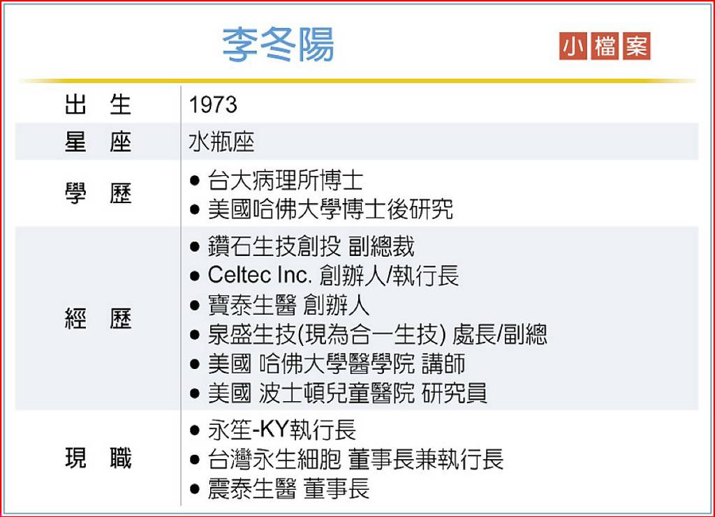 2021年2月空降接掌永笙-KY執行長,李冬陽翻轉過去永笙偏重臍帶血公捐與私存的營運模式,改以聚焦細胞服務、細胞供應、細胞新藥三引擎,搶攻細胞治療黃金十年的商機,打造國內再生醫療不一樣的新思維。
