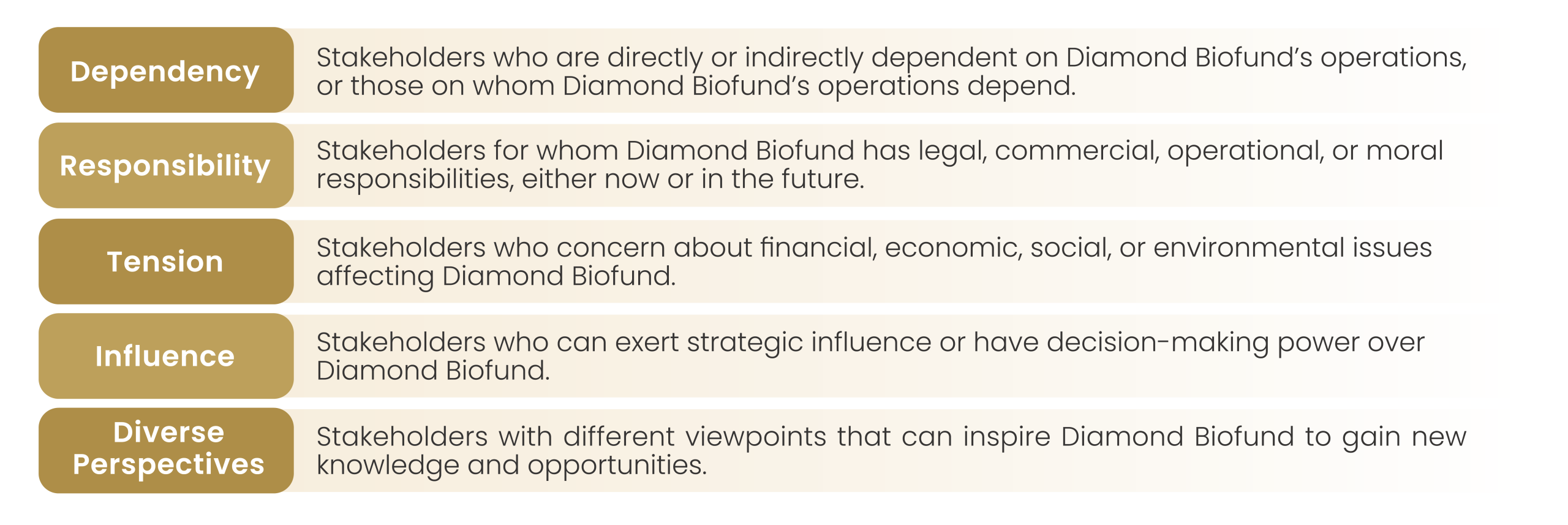Diamond Biofund conducts a material topic identification process once a year. Diamond Biofund references the AA1000 Accountability Principles Standard, using the four principles of ‘Inclusivity, Materiality, Responsiveness, and Impact’ to identify material topics. Through diverse communication channels with stakeholders, we assess the actual and potential impacts of environmental, social, governance, and human rights issues, which serve as the basis for the annual sustainability report disclosures and provide a reference for planning sustainability strategies.
