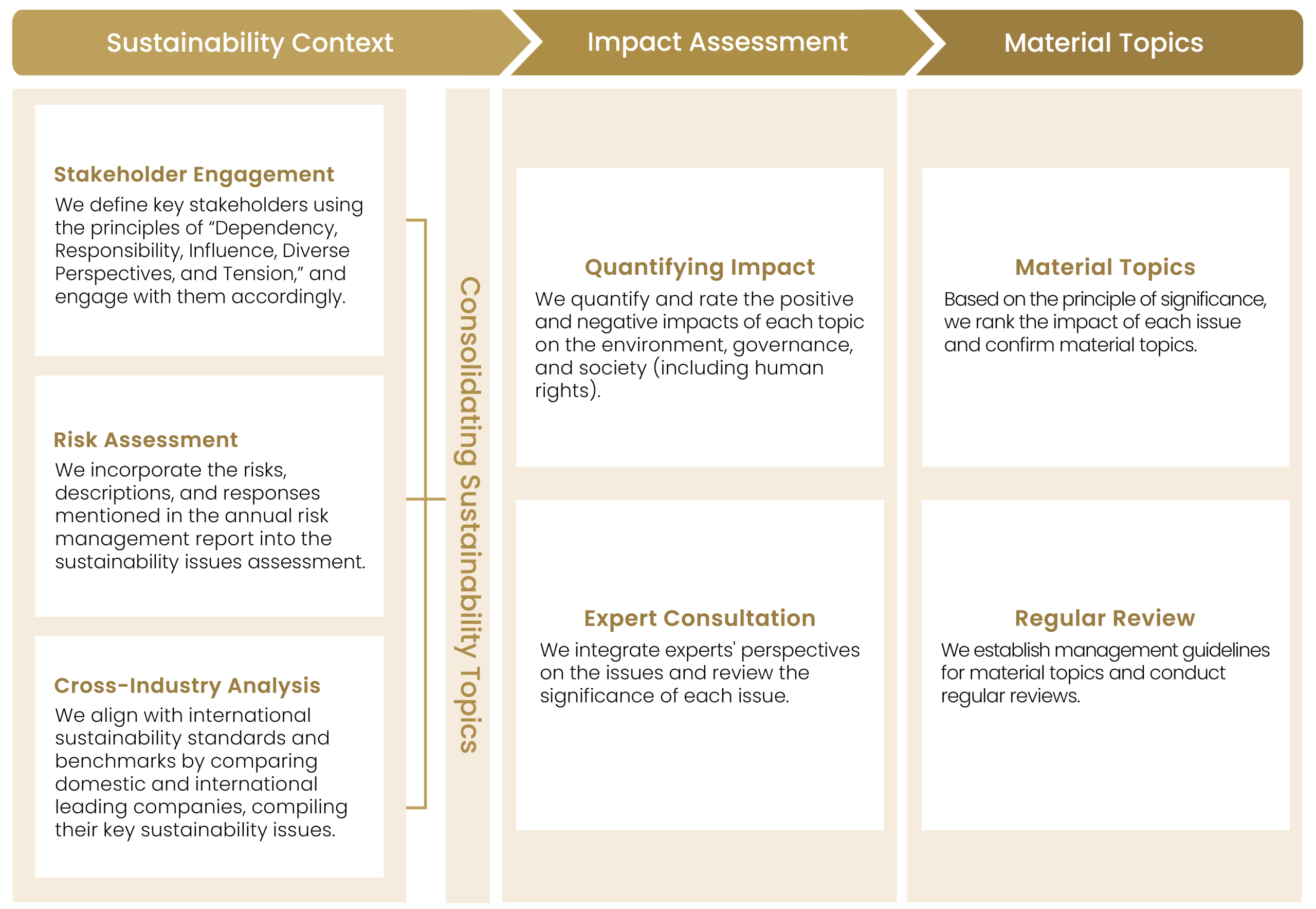 Referencing the new GRI standards, quantitative indicators are used to evaluate the positive and negative impacts of each issue. The scoring principle involves analyzing the positive and negative impact levels and the probability of the topics occurring through due diligence on the impact pathways of the topics. This is based on the dual materiality principle of “inside-out,” meaning the company’s impact on the external environment and society, and “outside-in,” meaning the external impact on the company’s operations. The product of these two factors is used to determine the impact level.