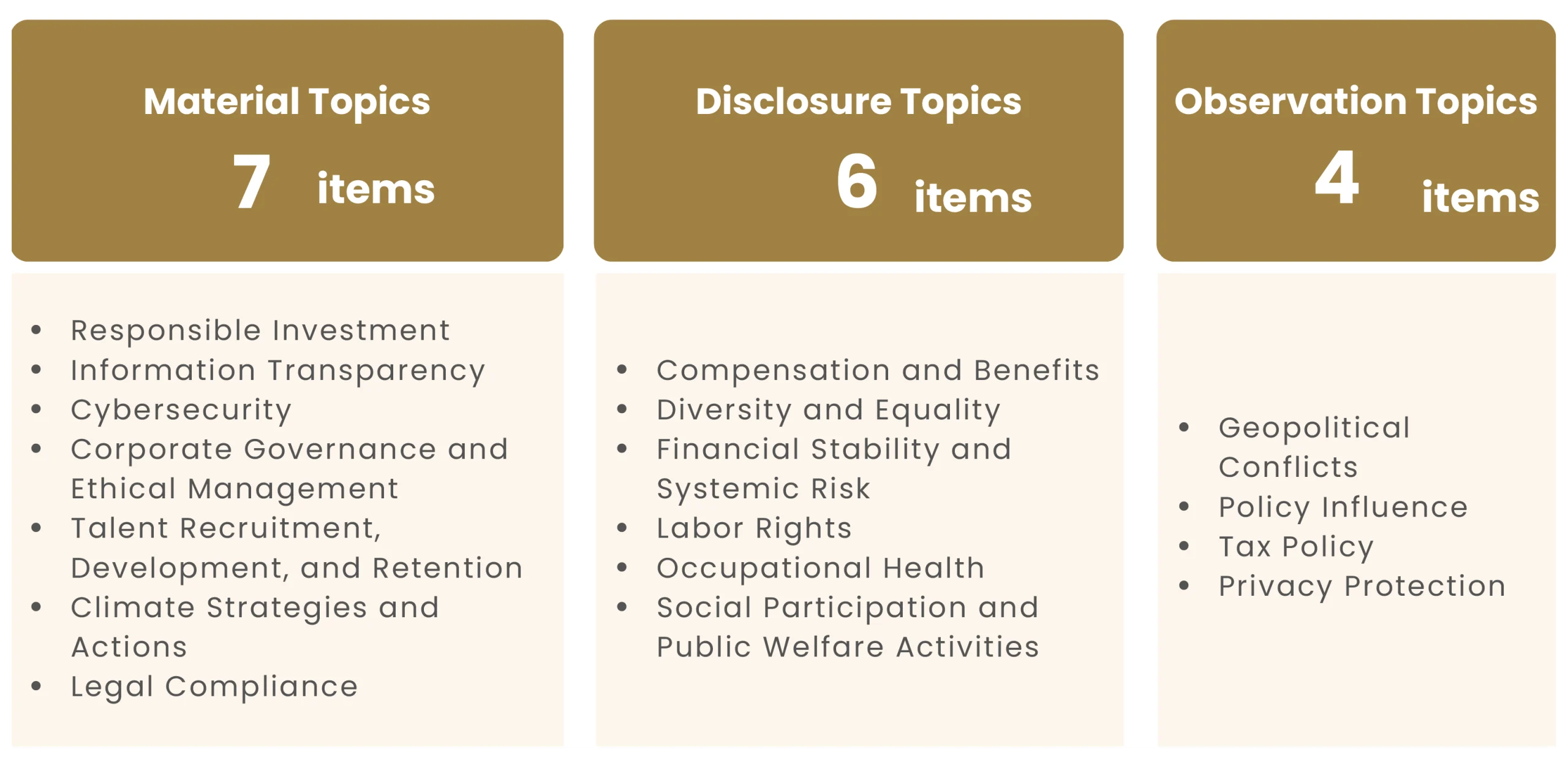 According to the above principles, there are seven material topics for this year, including “Responsible Investment,” “Information Transparency,” “Cybersecurity,” “Corporate Governance and Ethical Management,” “Talent Recruitment, Development, and Retention,” ” Climate Strategies and Actions,” and “Legal Compliance.”