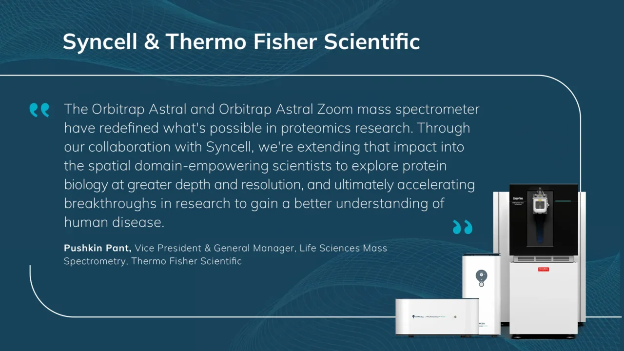 With this collaboration, Thermo Fisher and Syncell will enable researchers to implement unbiased spatial proteomics with high subcellular resolution to investigate the location and organization of proteins across tissues and cells without relying on predefined targets. This marks a major advance from traditional antibody-based spatial methods and introduces new possibilities for comprehensive protein mapping and discovery across biological systems in oncology, neuroscience, drug discovery, immunology, cell biology, and more.