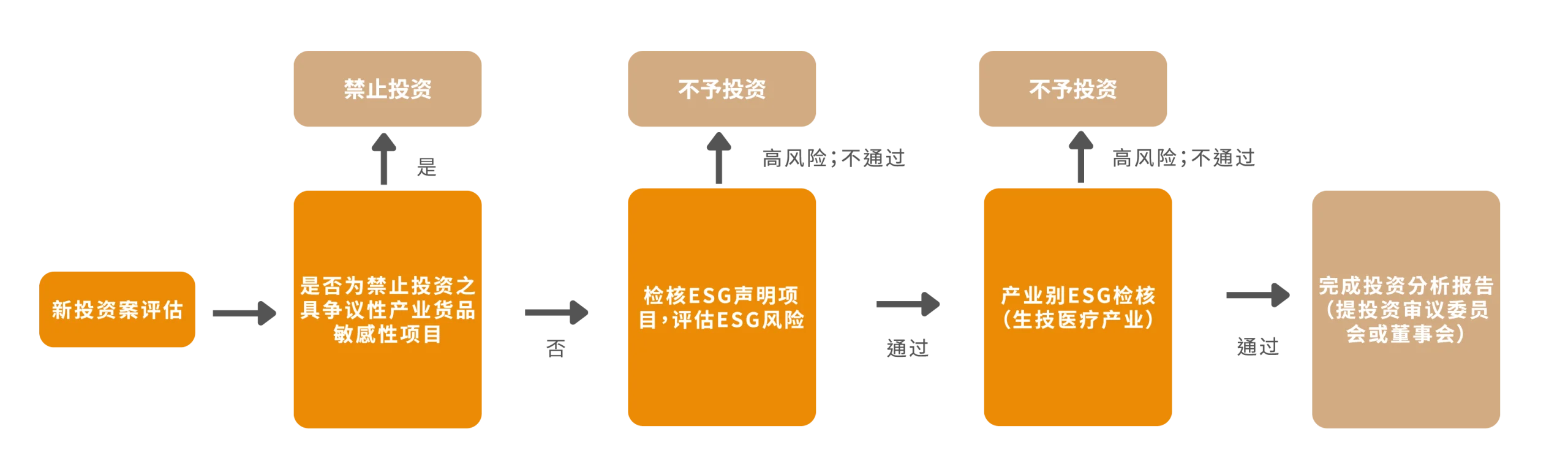 「新案开发与筛选」与「评估作业及尽职调查」作业阶段ESG管理流程图:
