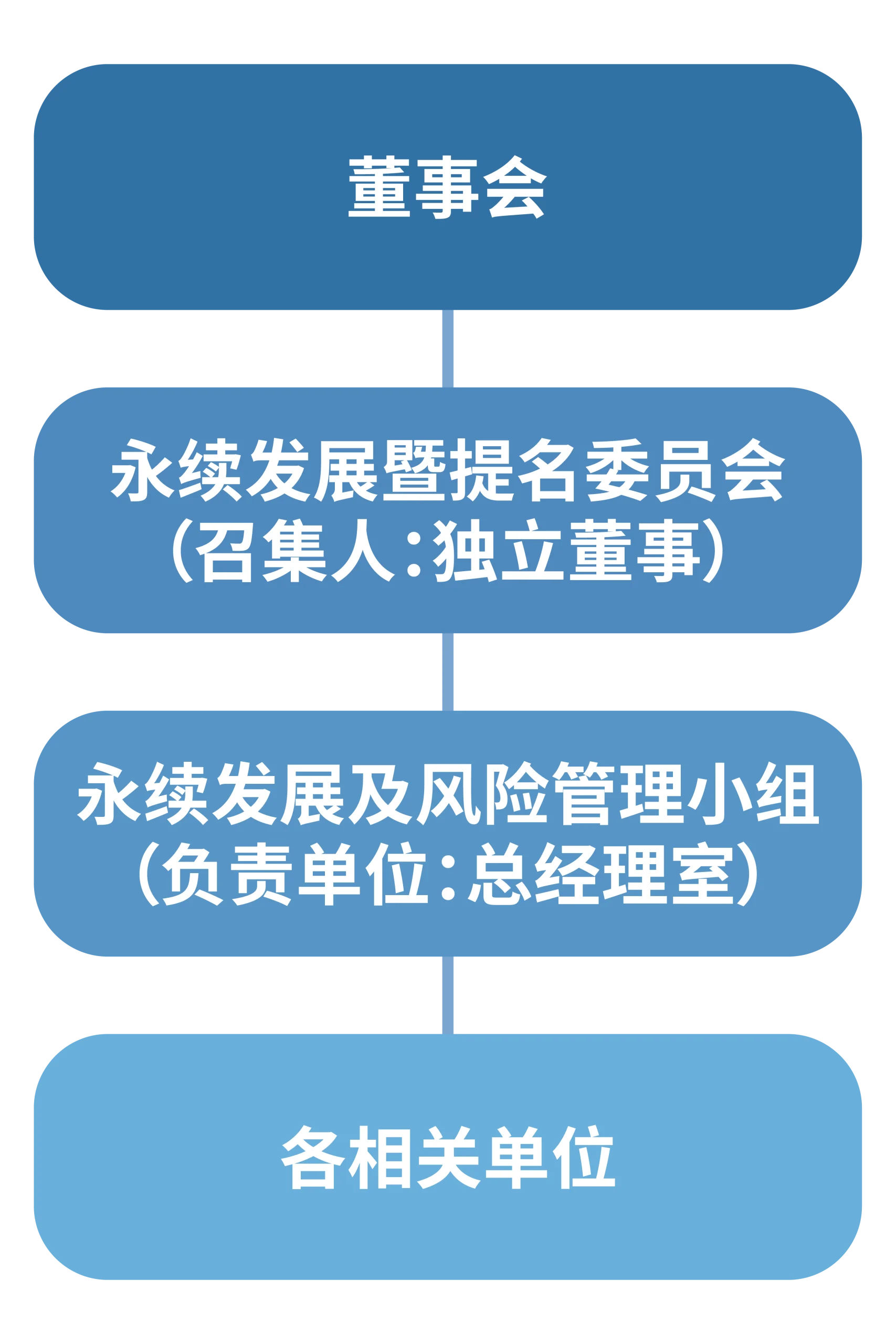 董事会为风险管理的最高决策单位,负责核准、审视与监督公司风险管理政策,确保风险管理的有效性,并负最终责任,董事会设置「永续发展暨提名委员会」之功能性委员会,定期听取公司永续发展及风险管理小组之报告,监督本公司及重要子公司运行风险管理之情形,并对于风险管理政策及程序等设计提出改善建议。目前「永续发展暨提名委员会」共有5名成员,其中3名为独立董事,并由独立董事担任召集人及会议主席。