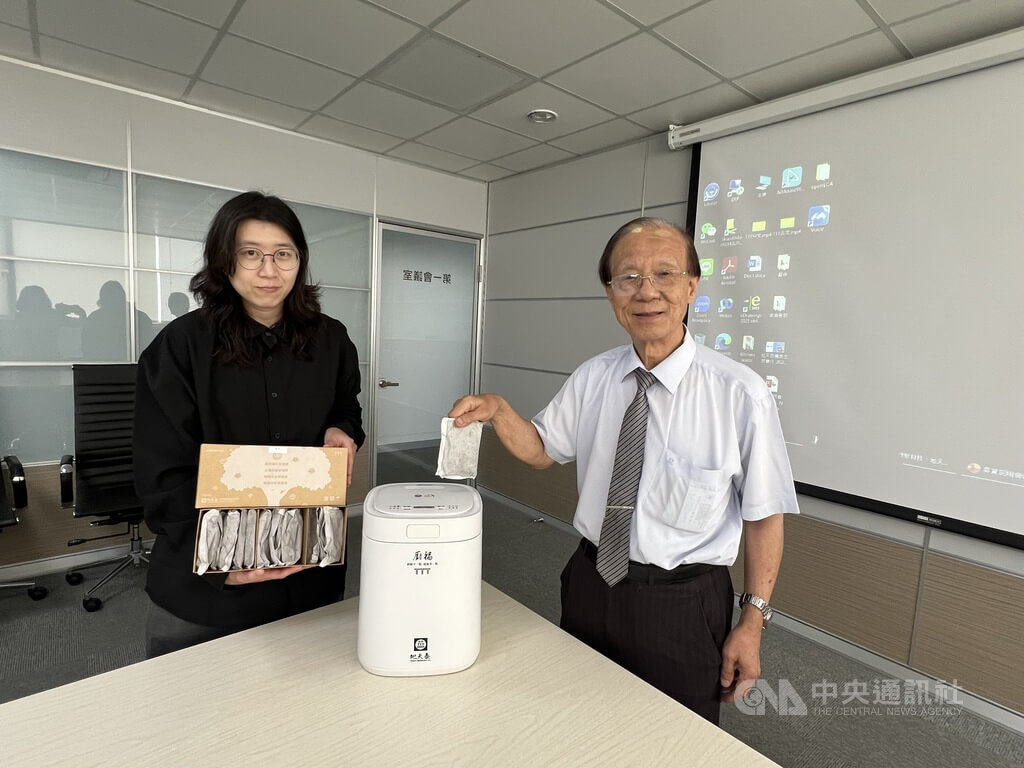 由中央研究院士杨秋忠(右)领军的地天泰农业生技股份有限公司有TTT技术,运用标靶酵素,可在3小时内将有机废弃物转成有机肥料,并生产小型厨余机。中央社记者郝雪卿摄 114年7月22日