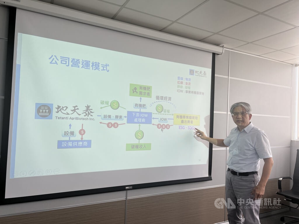 地天泰农业生技股份有限公司有TTT技术,可运用标靶酵素将有机废弃物在3小时内转成有机肥料,总经理杨礼亘说明公司营运商业模式。中央社记者郝雪卿摄 114年7月22日